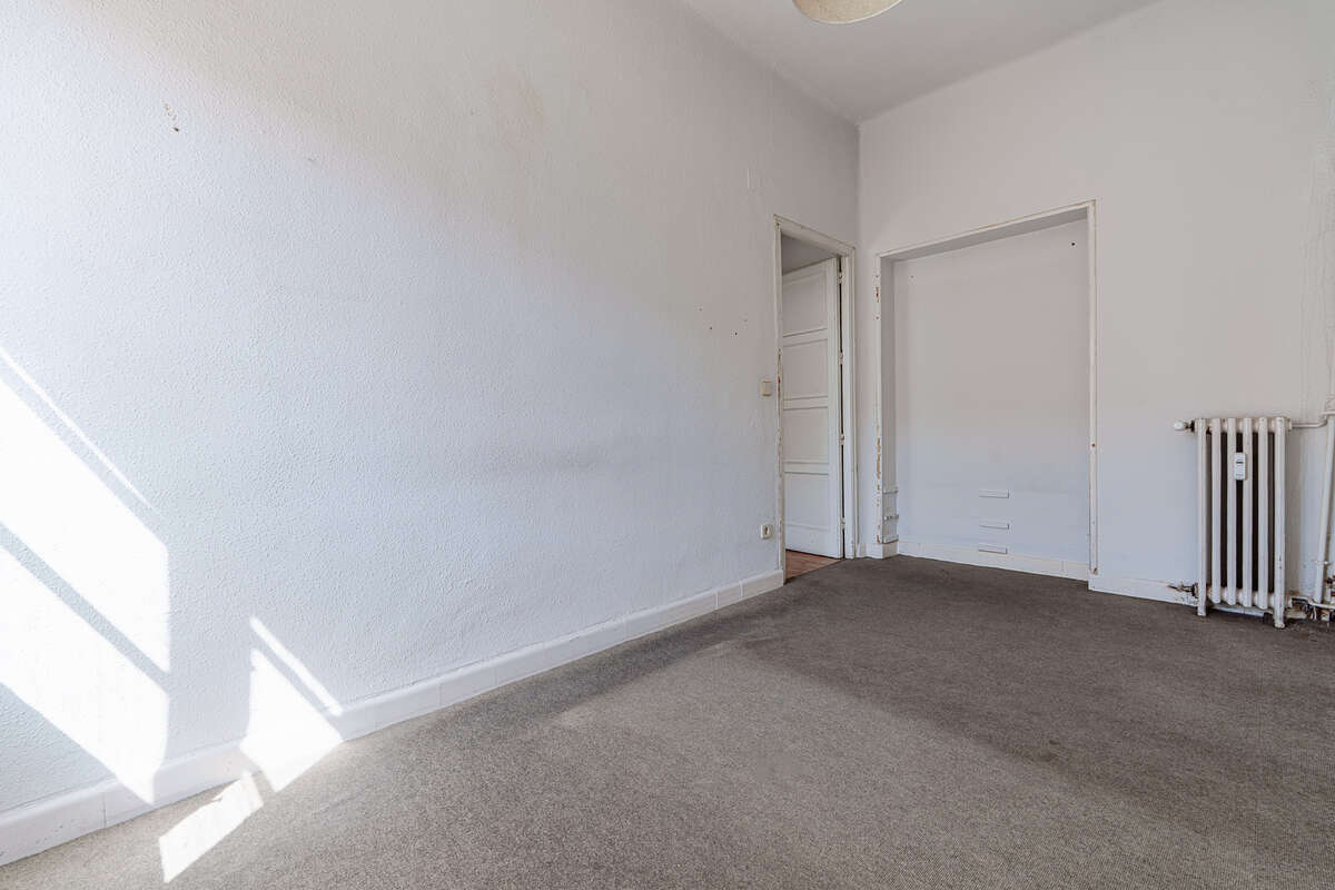 The home, which currently requires renovation, offers a floor plan with multiple possibilities for reconfiguration thanks to its versatile layout. In its current state, the property features a hallway leading to three spacious bedrooms, a full bathroom, and a separate kitchen. The living room, the heart of the home, benefits from a prime orientation that ensures maximum use of the space.